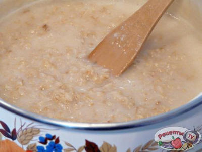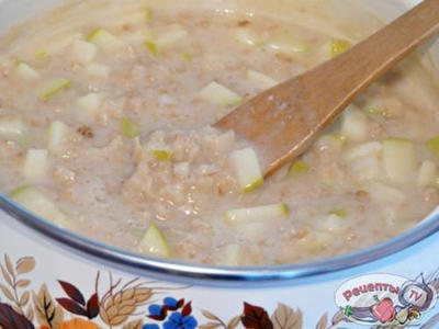 Овсяные хлопья насыпать в кастрюлю. Влить яблочный сок и молоко, добавить сахар.